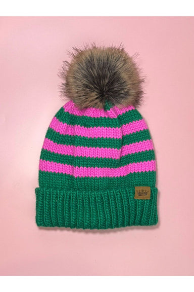 A classic cold-weather accessory, this cozy hat features a green and pink striped pattern, faux fur pom, cuffed hem, and fleece lining. Pair with t...