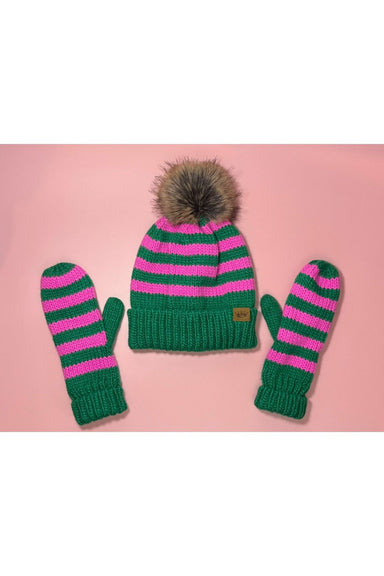 A classic cold-weather accessory, these mittens feature a green and pink striped pattern, ribbed cuffs, and cozy fleece lining. Pair with the match...
