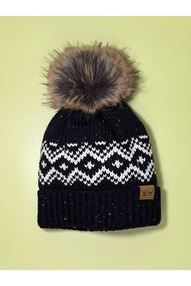A classic cold-weather accessory, this cozy hat features a black and white patterned knit with speckles throughout, faux fur pom, cuffed hem, and f...