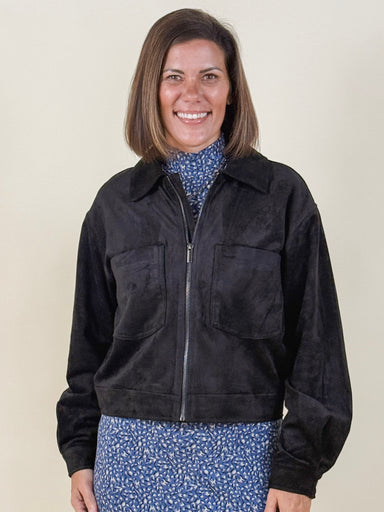 This faux leather bomber channels a classic vibe while still feeling modern and wearable. With its collared neckline, zip front, and flap pockets, ...