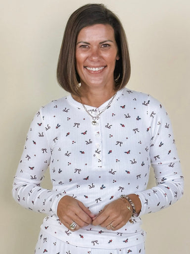 Soft pointelle fabric meets a cheerful holly berry and bow print for a fresh holiday twist. Designed in the same silky-soft pointelle, this long sl...